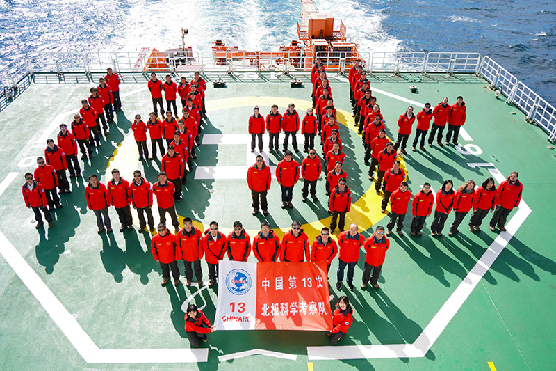 7月25日,为纪念中国第13次北冰洋科学考察队穿越北极圈,考察队全体成员在“雪龙2”号极地科考破冰船直升机甲板组成“13北”字样合影留念。