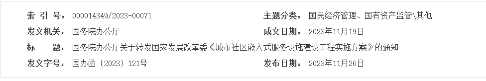 国务院办公厅关于转发国家发展改革委 《城市社区嵌入式服务设施 建设工程实施方案》的通知 国办函〔2023〕121号